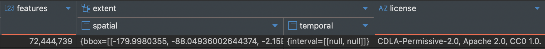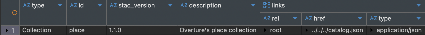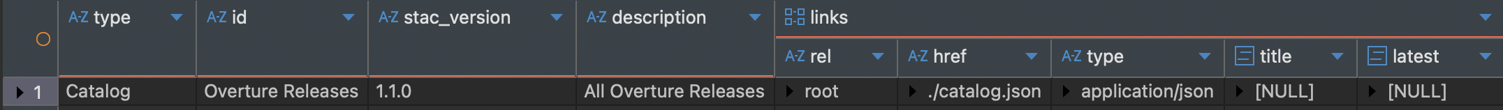 `type`, `id`, `stac_version`, `description`, `links`, `latest` 등 다양한 컬럼이 생성되었다.