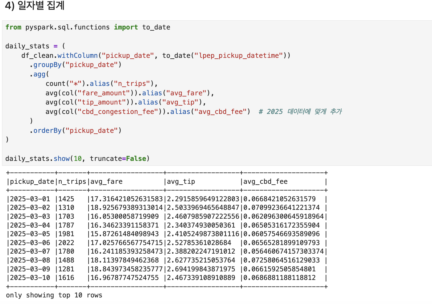 - pandas에서 사용했던 집계함수들을 pyspark에서는 functions에서 불러와줘야 한다. (ex. avg, count, sum, round 등)
