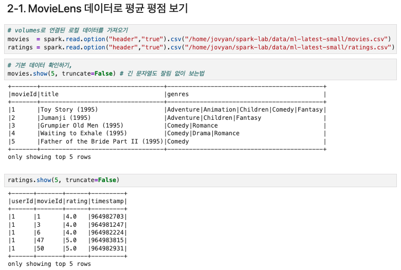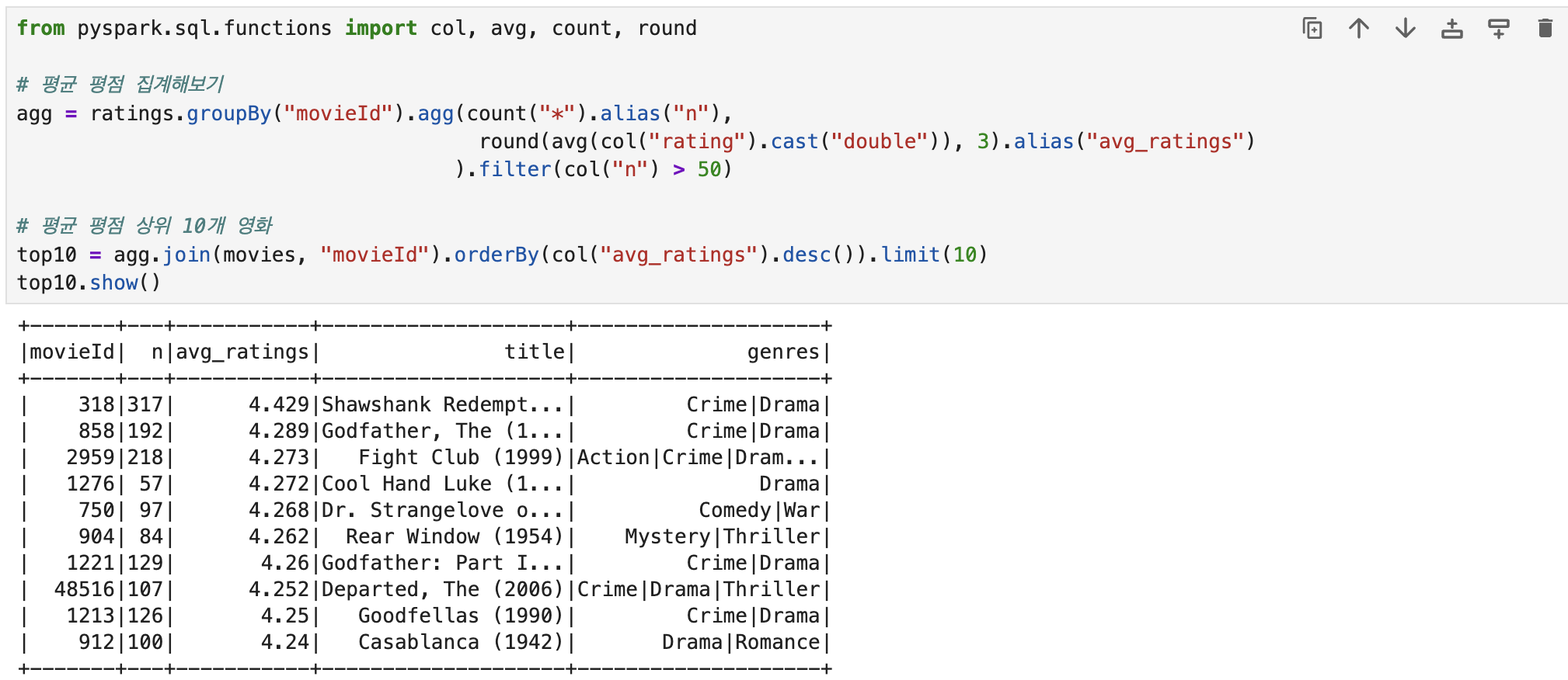 - round(avg(col("rating").cast("double")), 3).alias("avg_ratings") : rating 문자열 컬럼을 수치형으로 변환, 평균을 계산하고 반올림해서 소수점 3자리까지 표현하고 별칭은 "avg_ratings"로 설정