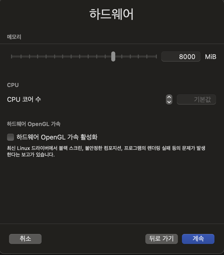 - 램 메모리 용량을 설정해줘야 하는데, 보통 자신의 노트북/컴퓨터의 램 용량의 절반을 부여해준다. 나는 16gb라서 8gb를 선택