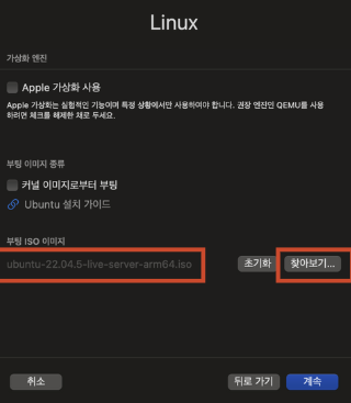 - <부팅 ISO 이미지> 에서 <찾아보기...> 클릭 후 다운받은 ubuntu.iso 파일을 선택하고 <계속> 클릭