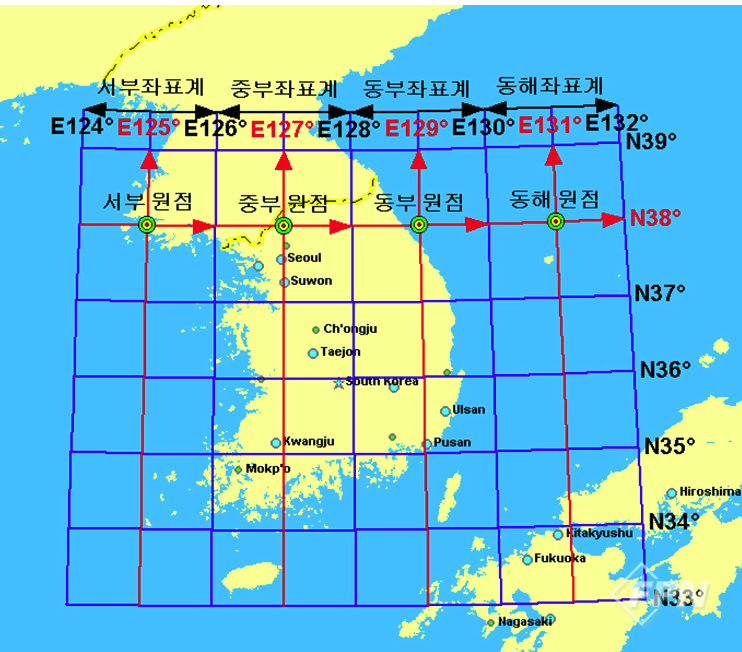 | 중부원점 | 127°E | 38°N | 미터(m) | 5186 (Bessel) / 5181 |